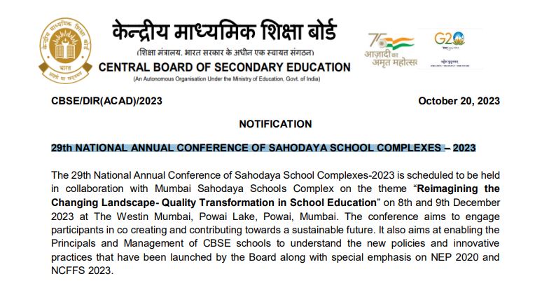 Mumbai, India: The 29th National Annual Conference of Sahodaya School Complexes-2023 is set to be an insightful event. In collaboration with the Mumbai Sahodaya Schools Complex, it will be held at The Westin Mumbai, Powai Lake, Powai, Mumbai on the 8th and 9th of December 2023. The overarching theme for this conference is “Reimagining the Changing Landscape – Quality Transformation in School Education.” The event is aimed at fostering co-creation and contribution toward a sustainable future. Additionally, it seeks to empower the principals and management of CBSE (Central Board of Secondary Education) schools with knowledge about the new policies and innovative practices introduced by the Board, with a particular emphasis on NEP 2020 (National Education Policy 2020) and NCFFS 2023 (National Curriculum Framework for Future Skills 2023).