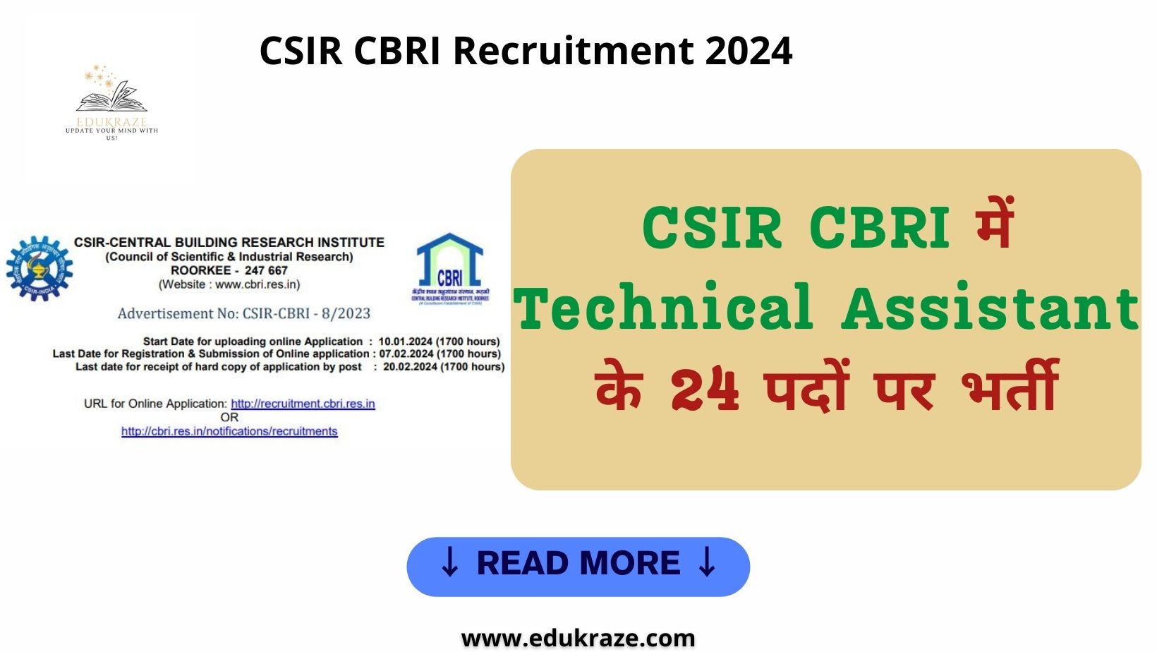 Introduction: CSIR CBRI Roorkee has released a recruitment notification for Technical Assistant positions. The application process begins on January 10, 2024, and the last date to submit applications is February 07, 2024. Interested candidates meeting the specified qualifications can apply online for 24 Technical Assistant vacancies.
