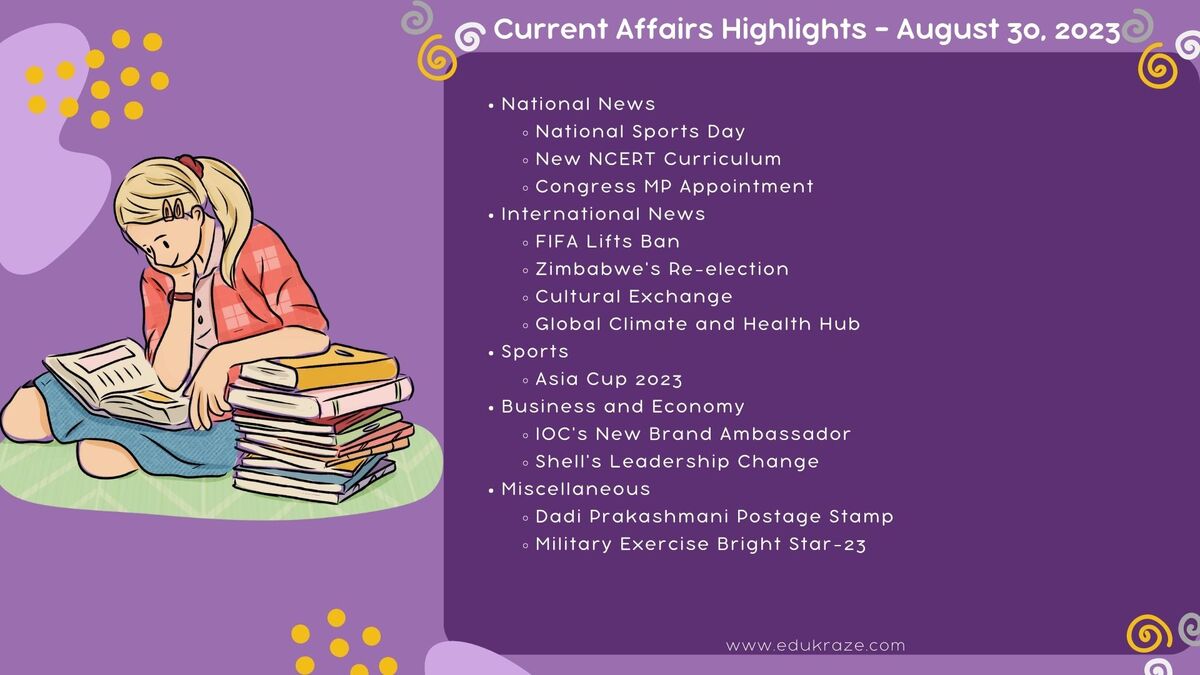 Get a roundup of key events from National News, International News, Sports, Business, and more in the August 30, 2023, edition of current affairs highlights.